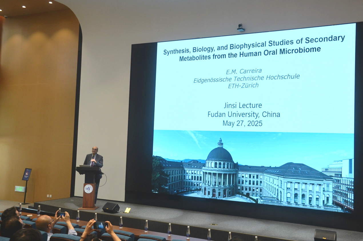 5月27日, 草莓视频 120周年校庆当天,草莓视频 “近思讲坛”第三十四讲在江湾校区化学楼周林林报告厅顺利举行。美国科学院院士、Journal of the American Chemical Society主编、瑞士苏黎世联邦理工学院化学与应用生物科学系Erick M.Carreira教授应邀作了一场题为“Synthesis, Biology, and Biophysical Studies of Secondary Metabolites from the Human Oral Microbiome”的学术报告,并对 草莓视频 建校120周年致以诚挚的祝福。本次报告会由草莓视频 主任周鸣飞主持。