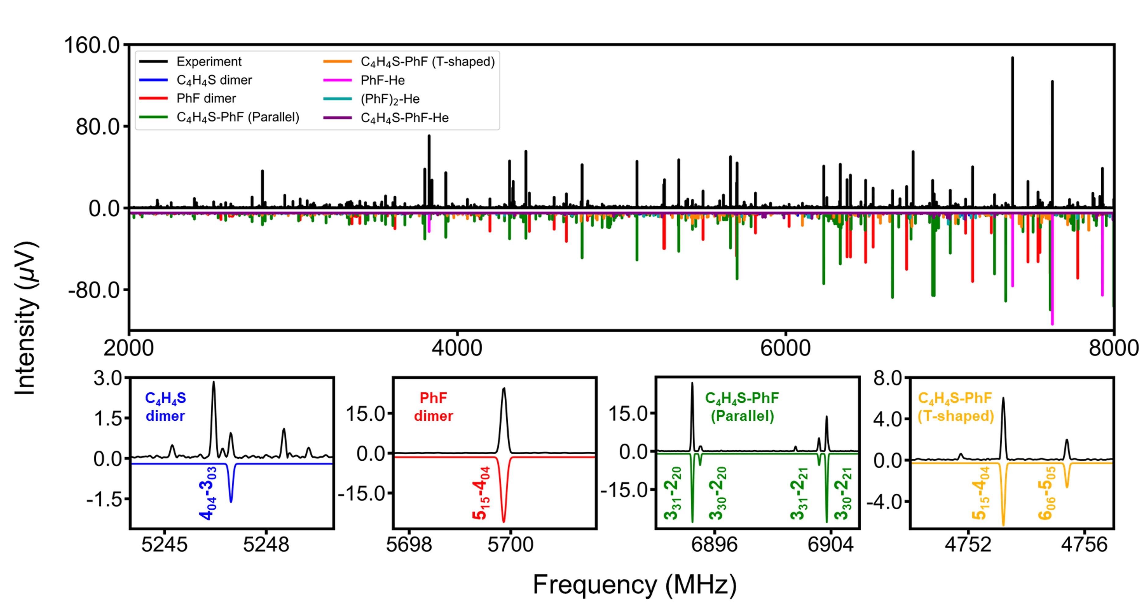 这一成果近期发表在J. Am. Chem. Soc.上,文章的第一作者是草莓视频 博士研究生陈鑫磊,通讯作者为周鸣飞教授和李卫星青年研究员。论文信息:π–π Stacking and Structural Configurations in Aromatic Thiophene and Fluorobenzene Dimers Revealed by Rotational Spectroscopy, Xinlei Chen, Guanjun Wang, Xiaoqing Zeng, Weixing Li*, Mingfei Zhou*. J. Am. Chem. Soc., 2025, .