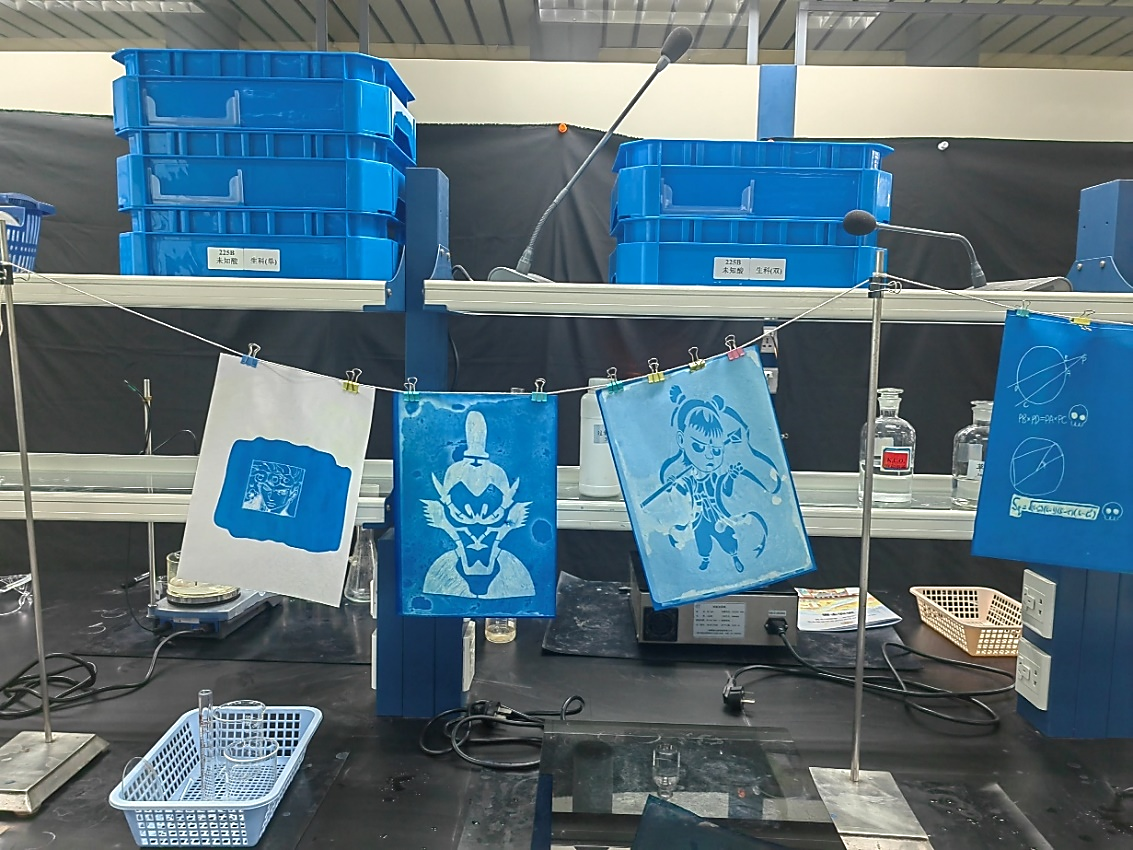 在老师们的悉心指导下,营员们体验了蓝晒法印像实验,从制备光敏材料开始,创作独特的蓝晒作品。当将设计好的图案作为模板覆盖在感光纸上,置于光线下曝光时,神奇的光化学反应便悄然发生。营员们充分发挥创意,印制出风格多样的蓝晒作品。这些凝结了化学智慧与艺术巧思的作品,最后被塑封保存,成为同学们带回家中珍藏的独特科学营纪念。
