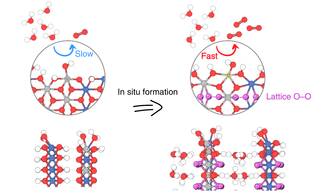 研究团队结合同位素标记的原位光谱技术与机器学习辅助的理论模拟,首次发现在电催化OER条件下,镍铁氢氧化物在反应中会转化为超氧-氢氧化物结构,并形成稳定的O–O配体。这些原位生成的O–O配体能够有效调控并活化催化剂表面的铁位点,大幅提升了析氧反应活性。该研究不仅揭示了配体微环境动态重构在电催化中的关键作用,更突破了以往仅依赖金属电子结构为活性描述符的传统设计范式,为发展新一代低成本、高性能电解水析氧催化剂提供了重要的理论依据与指导。