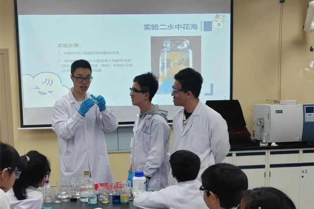 第二个专题带领孩子们探索了“海洋之魂”和“瓶中红绿灯”的实验。亚甲基蓝和靛蓝胭脂红在氧化还原反应中呈现出不同的颜色变化,孩子们通过搅拌溶液,亲眼见证了化学反应的神奇,宛如魔法般的化学变化让他们乐在其中。