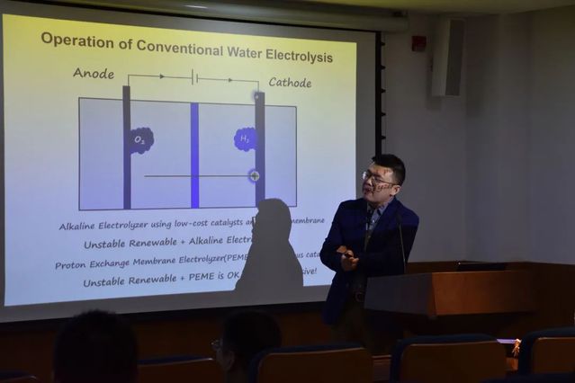 学生报告结束后,王永刚老师为大家带来电解水制氢气的前沿进展。王老师着重讲述了利用电池电极解耦电解水过程的研究思路和成果,介绍了利用氢氧化镍电极将电解制氢和制氧的过程分离的技术,特别是将成果产业化、商品化的过程和设想,从化学工程的视角为同学们展现了化学有别于基础研究的另一面。