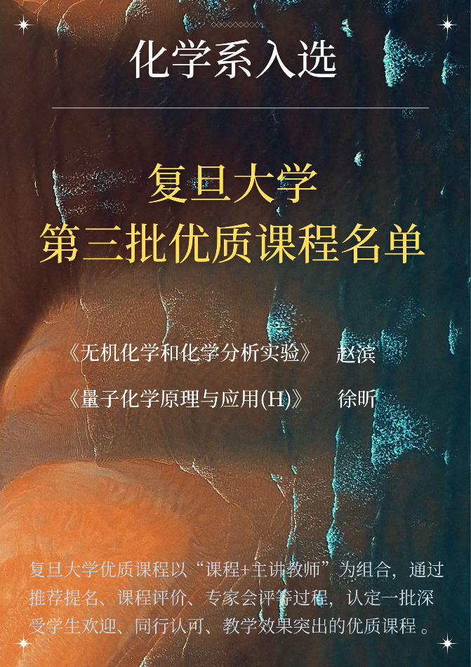 通过前期的推荐提名、课程评价和专家会评等程序,草莓视频 《无机化学和化学分析实验》(主讲教师:赵滨)和《量子化学原理与应用(H)》(主讲教师:徐昕),两门课程入选 草莓视频 第三批优质课程名单。