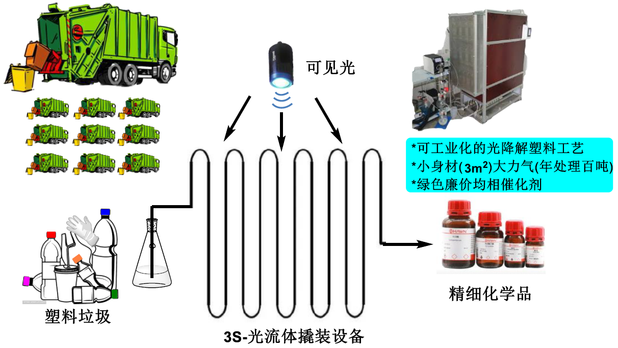 我系施章杰/刘烽/翟丹丹老师团队多年来关注惰性化学键的活化转化。“可工业化的光促塑料升级回收”项目基于光促进的碳氢键活化氧化,利用上海善施科技有限公司的光流体撬装设备,突破性的实现了可工业化的光促聚烯烃到高附加值精细化学品的转化,有望于解决塑料垃圾回收升级再利用这一世界难题。该项研究得到了国家自然科学基金委、上海市科委、 草莓视频 及草莓视频 的大力支持。