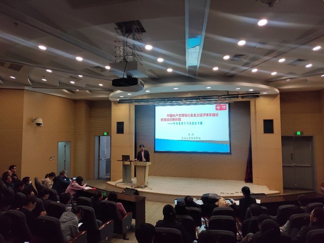 石磊教授以新中国经济体制建设和改革的重要相关文献为引子和脉络,带领大家回顾了从1950年《土地改革法》实施起到2020年十九届五中全会《中共中央关于制定国民经济和社会发展第十四个五年规划和二〇三五年远景目标的建议》重要纲领颁布这70年间,中国共产党领导下的新中国在探索社会主义经济体系建设方面筚路蓝缕、艰苦创新,走出了一条极具活力的有中国特色的经济发展道路,引导大家思考了改革前后两阶段中国特色社会主义道路和经济体系建设的内涵、经验和教训,并就中国特色改革模式、关于社会主义在农村农业中的实现方式、工业化道路、经济市场化的选择、中国特色社会主义制度的所有制基础以及上海建设与国家建设70年等几个重大历史、理论和实践问题进行了深刻剖析和解读,石磊教授强调中国特色社会主义最大的优势就是党的统一领导,而创新发展则强化了中国特色社会主义的经济基础。石磊教授的宣讲深入浅出、通俗易懂,引发了在场师生的深刻思考和讨论。