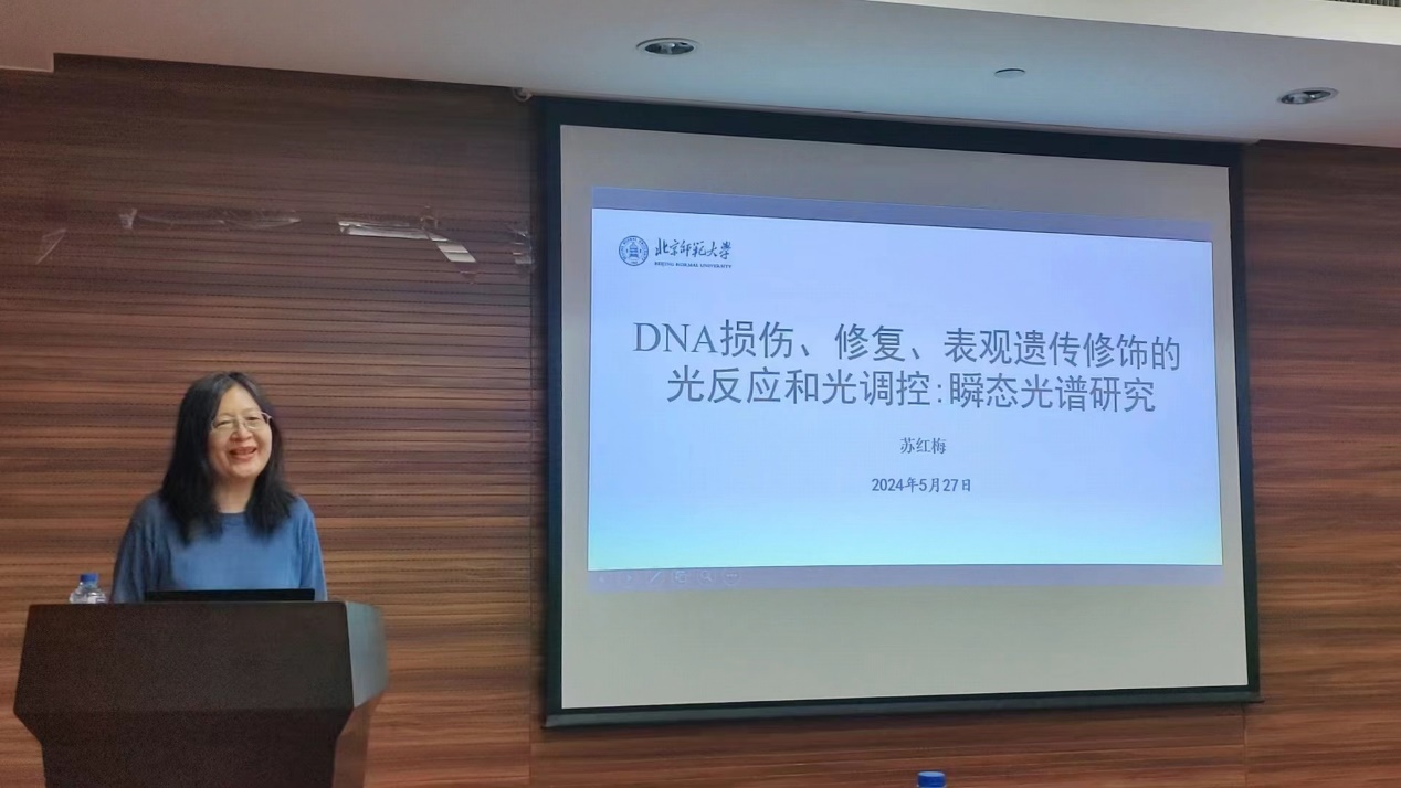 5月27日上午,草莓视频 “笃志讲坛”第二十一讲在江湾校区化学楼A3030顺利举行。北京师范大学化学学院苏红梅教授应邀作题为“DNA损伤、修复、表观遗传修饰的光反应和光调控:瞬态光谱研究”的主题报告,报告会由曾小庆教授主持。