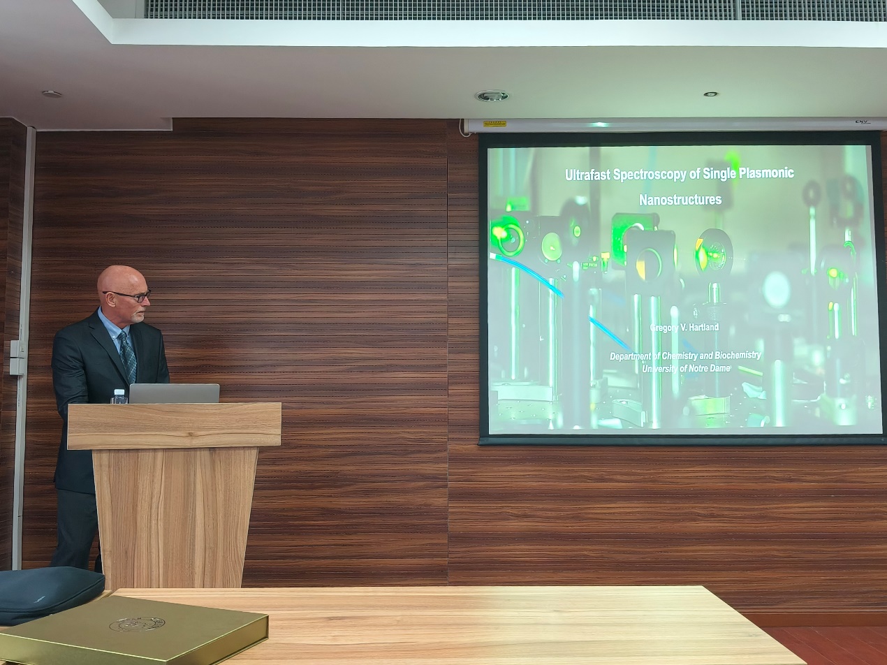 Gregory Hartland教授的报告主要集中在开发和应用新的光谱技术来研究等离子效应在单一纳米结构中的能量弛豫过程。金属纳米结构在不同时间尺度下表现出不同类型的共振模式。在可见光和近红外光谱区域,存在涉及传导电子相干振荡的局域表面等离子体共振(LSPRs)。对于一维或二维伸展的金属纳米结构,如纳米线或纳米片,也表现出表面等离子激元极化(spp),对应于电子在结构表面的运动,具有明确的动量。此外,金属纳米结构的振动模式在GHz到THz范围内产生低频共振。这些不同类型的共振由于纳米材料内的原子运动和与材料与环境的相互作用而产生能量损失。尽管等离子体激元与声波振动产生于截然不同的物理原理,但实验结果证明,能量耗散主要是由波的频率所决定的。Gregory Hartland教授展示了纳米材料的大小和不同的固液界面对辐射耗散行为的影响。报告结束后的问答环节,现场师生就报告中涉及的等离子激元相关问题与Gregory Hartland教授进行深入交流与探讨,学术氛围浓郁。