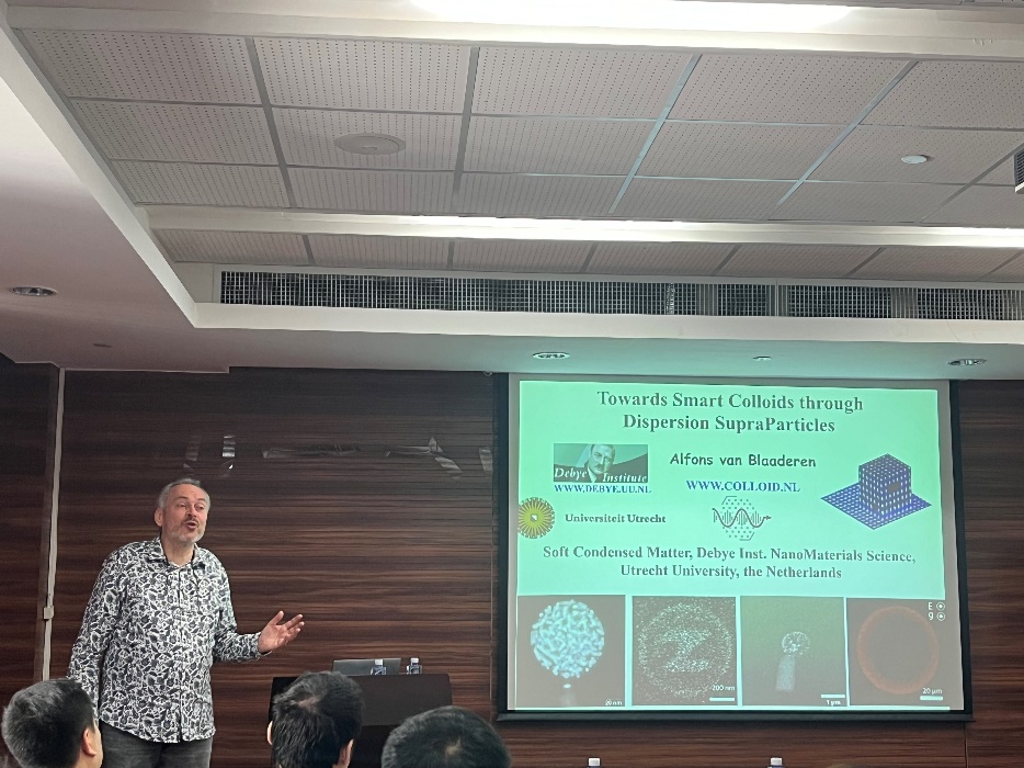 Alfons van Blaaderen教授开发了一系列创新性的自组装方法,涵盖了在限制空间内、受外部场影响以及通过沉降方式进行的组装,为分析各种热力学系统和凝聚态物理现象搭建了理想的实验平台。其相关研究成果已发表在Science、Nature等国际著名刊物。Alfons van Blaaderen教授的报告主要集中在胶体晶体的自组装基础研究及其应用。在自组装的基础研究方面,他们通过显微镜技术详细描述了胶体自组装的三维结构,取得了显著进展。首先,他们利用共聚焦显微镜观测了微米尺度单组分胶体晶体的自组装过程。随后,针对纳米晶组装体,运用透射电子显微镜(TEM)结合三维重构技术,深入了解超晶体的三维结构。此外,该团队还探讨了在受限空间中纳米晶的曲率对超晶体结构的影响,发现粒子形状从尖锐立方体变为圆角立方体的过程中,粒子的位置和取向呈现出复杂的相互作用。这一发现揭示了尖锐立方体可以整齐排列形成简单的立方超结构,而圆角立方体则倾向于组装成结构更为复杂,具有更强局部取向的十二面体簇。在应用研究方面,他领导的团队研究成果也展现了广泛的应用潜力,包括用作电子书显示的电荷胶体墨水以及构建光子晶体的高折射率胶体阵列等。报告结束后的问答环节,现场师生就其研究的方向与内容中遇到的问题与Alfons van Blaaderen教授进行深入交流与探讨,这进一步促进了学术思想的碰撞与知识的传播。