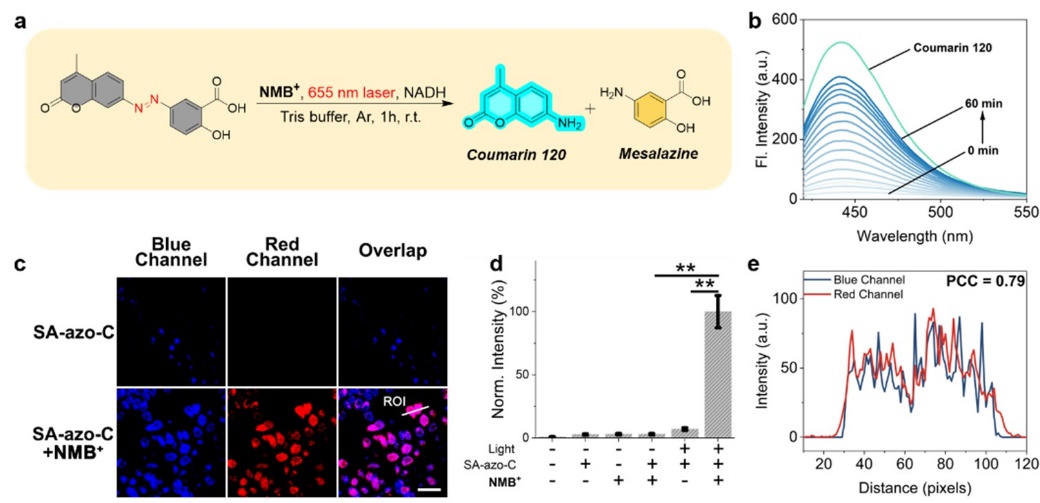 图2. 溶液相及乏氧细胞内红光催化偶氮前药激活及荧光示踪。图片来源:J. Am. Chem. Soc.