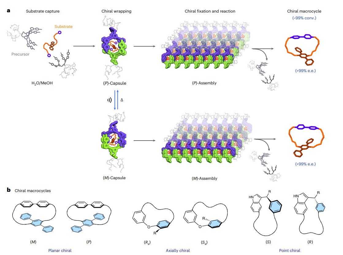 2023年7月4日,《自然·合成》(Nature Synthesis)杂志上在线发表了草莓视频 李明洙教授/孙默青年研究员团队的最新成果《Enantiocontrolled macrocyclization by encapsulation of substrates in chiral capsules》。该研究利用超分子化学的底物诱导自组装的概念和非共价键的动态特性,调控手性自组装过程,可以合成任一想要的对映异构体,实现手性大环化合物的精准构筑。同时,Nature Synthesis以《Chiral macrocycle formation within chiral capsules》为题发表Research Briefing文章,重点介绍课题的研究背景、意义和背后故事。荷兰格罗宁根大学的Nathalie Katsonis教授对该研究给予了高度评价,“实现大环化已属实不易,作者竟然发现了能够控制立体选择性的大环化策略,这可不是件小事!”