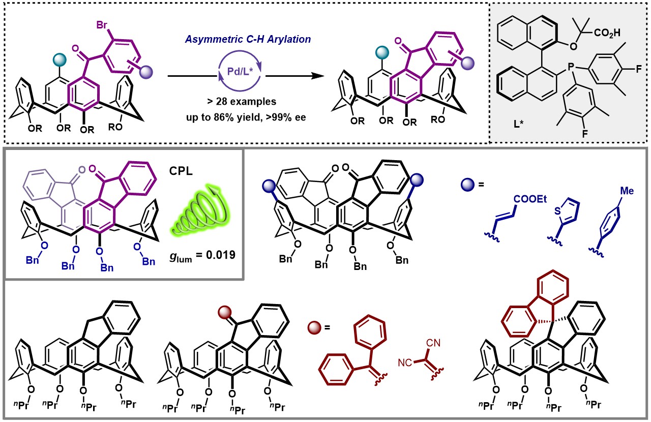 近日,我系蔡泉课题组发展了一种钯催化分子内C-H芳基化反应,有效构建了固有手性杯[4]芳烃。他们通过发展一种新的手性双官能团羧酸—膦配体与钯协同催化,成功地实现了关键的协同金属去质子化过程。利用该方法以高产率和高对映选择性制备了多个含芴酮骨架的固有手性杯[4]芳烃;并通过后期修饰可转化为其他含有趣结构的手性杯[4]芳烃。同时,在光谱实验中发现,双芴酮结构表现出优异的圆偏振发光(CPL,Circularly Polarized Luminescence)性质,具有较大的发光不对称因子(glum = 0.019)。因此。这类分子在手性有机发光材料领域具有潜在的应用价值。