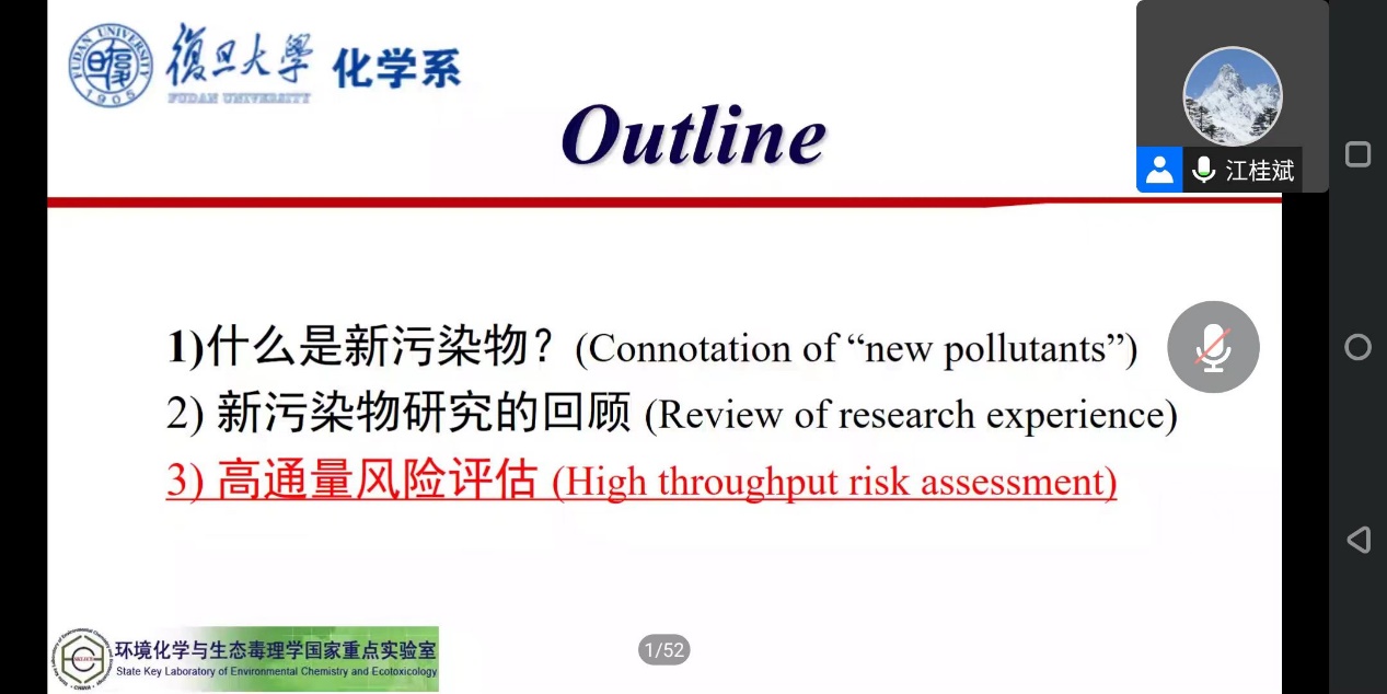 江桂斌院士首先介绍了什么是新污染物。他指出,任何人工合成或自然界存在的化学品或微生物,其环境赋存可引起显著的已知或可疑的毒性作用与健康危害的皆称为新污染物。其共性特征有三:一是,绝大多数为目前大量生产和应用的化工产品,尚未有效对其生产和环境排放加以控制;二是,污染正在发生,环境介质中的存量较高,对污染的源和汇及迁移特征仍缺乏足够认知;三是,缺乏生态风险、健康风险和毒理的数据,对新污染物的环境风险还缺乏全面的科学评估。围绕着其课题组承担的科研项目及开展的科研工作,江院士详细分析了我国的污染情况,新污染物的毒性、发展态势、对环境健康的影响以及如何着手监测、正确的防治策略等。最后,江院士阐述了关于“高通量风险评估”等相关内容。江桂斌院士的报告深入浅出,引起了线上师生的极大兴趣。报告结束后,江院士耐心解答了与会人员提出的问题。