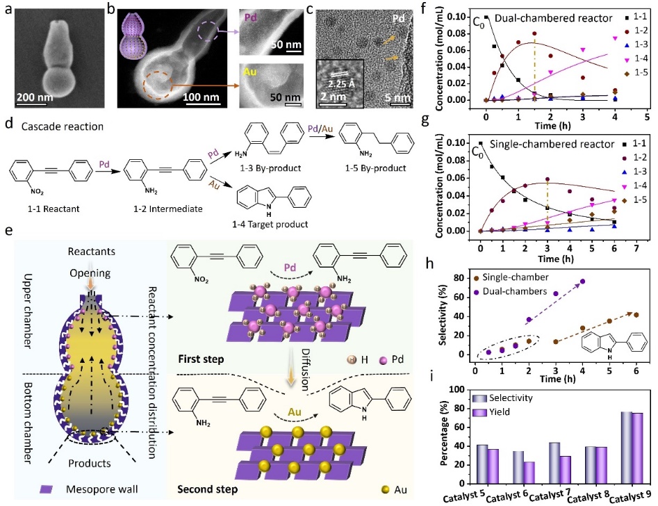 基于此, 草莓视频 赵东元院士、李晓民教授团队通过一种纳米液滴的分步重塑策略合成了具有可调腔室数量(由1个到3个)和腔室分布的多腔介孔纳米颗粒。通过原位的分步共组装进一步在单颗粒水平实现了多功能(磁性、催化、光学等)实体的分离和配位构建。此外,通过在双腔开口葫芦的上腔植入Pd纳米晶,在底腔锚定Au纳米颗粒设计了具有空间分离双活性位的双腔纳米反应器。在级联反应合成2-苯基吲哚方面表现出良好的催化性能,选择性高达76.5%,是单腔室纳米反应器(约41.3%)的1.85倍。