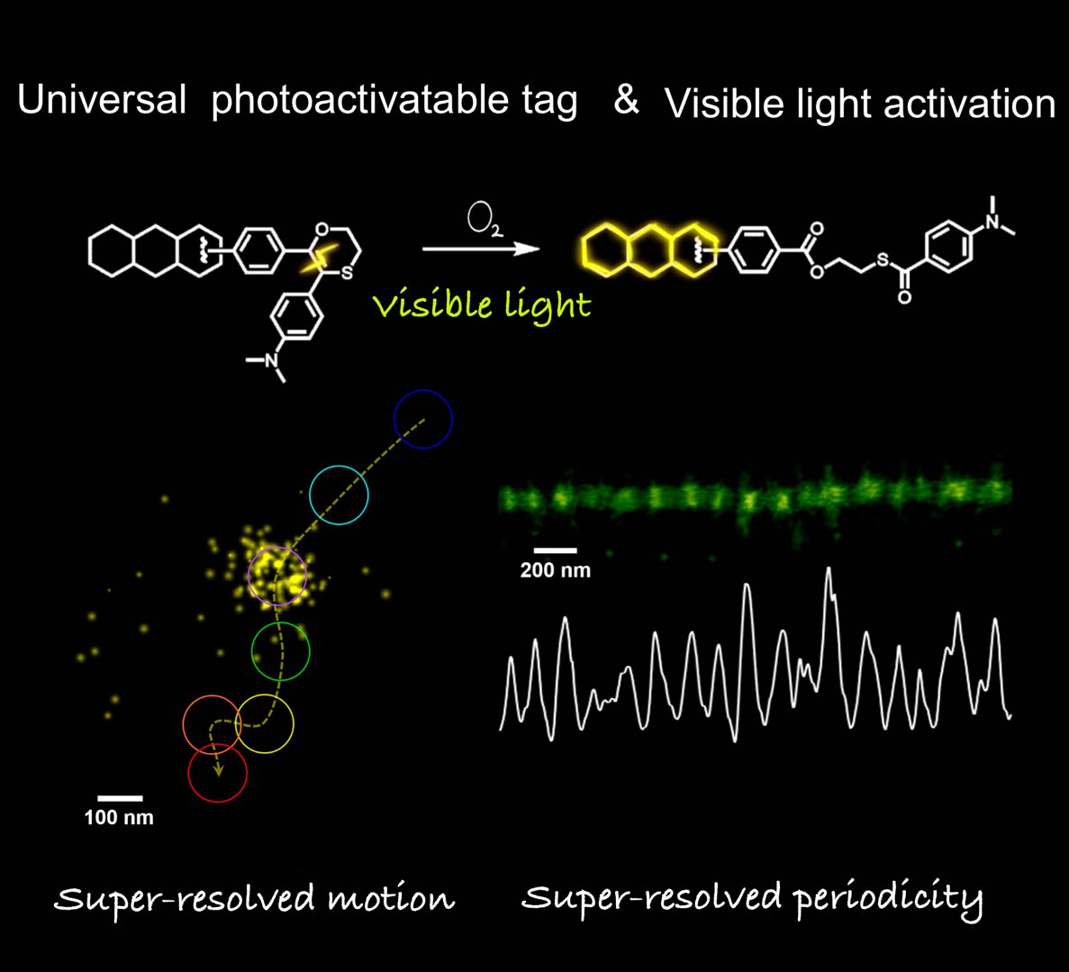 超分辨成像方法打破了传统的光衍射极限,实现200 nm以下的分辨率。基于光激活的单分子定位显微成像是超分辨荧光成像的一种,利用单个分子的光开关性质,每张采集的图像区域内只有小部分荧光分子处于荧光态,大多数荧光分子处于暗态,通过提取每张图像单分子定位信息,将数千张图像重组成一张超分辨图像,使它成为研究细胞超微结构的有力工具。基于单分子定位超分辨成像需要光可调荧光分子,为开发光激活探针通常是引入可光裂解或光转化的光笼基团,从而实现荧光分子的光物理性质改变进而淬灭荧光,然后在特定激光激发下使光笼基团分解或离去而恢复荧光态。这一过程通常需要两束光,高功率的紫外光活化以及低功率的可见光激发。这两束光需要在时间和空间上同步,此外紫外光对生物样品有明显的光毒性。
