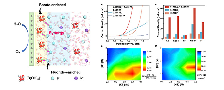 针对这些问题,近日 草莓视频 龚鸣青年研究员课题组与华东理工大学练成研究员课题组合作发现在中性电解液中同时引入硼酸根离子(Bi-)和氟离子(F-),可改变电极/电解液界面微环境形成分级离子排列结构,进而显著提升中性析氧反应(OER)性能。研究发现使用易合成的Co(OH)2催化剂时,使用F-:Bi- =1.5:0.4的比例可产生强协同效应,比单阴离子添加的情形活性可提高接近一个数量级。在高载量Co(OH)2的电极上可在1.791 V vs. RHE的电位下电流密度可达100 mA/cm2,并能够实现14天的稳定运行。反应动力学测试、探针辅助原位拉曼光谱以及分子动力学模拟证明F-会打破水的氢键网络,使得Bi-更靠近电极表面,处于内亥姆霍兹层,而F-会处于离电极较远的外亥姆霍兹层,形成分级离子排列结构。这种结构能够强化局部电场并加速电极表面的质子转移,从而提高了中性析氧反应的活性。该研究不仅为电催化复杂界面结构的设计和优化提供了新的视角和思路,而且为更为高效的中性电催化过程提供了更多的可能性。