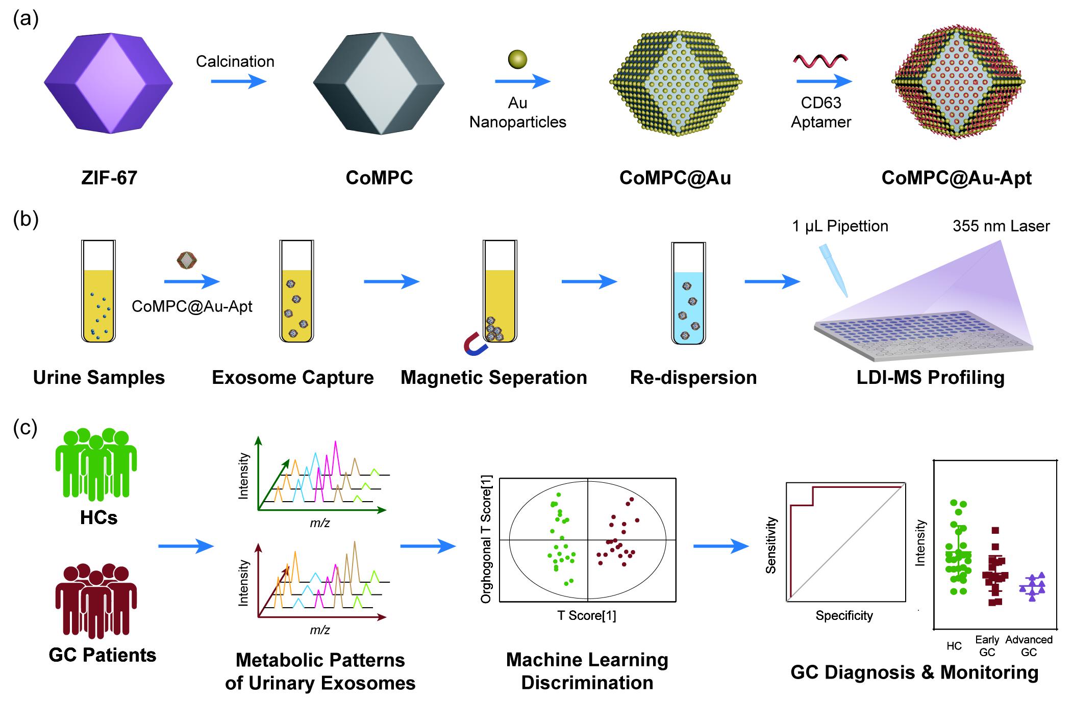 近日,草莓视频 邓春晖教授团队, 草莓视频 附属中山医院沈锡中教授团队成员孙念荣副研究员报道了整合提取外泌体代谢特征用于早期胃癌检测的相关研究。本文设计合成了适配体偶联多态碳材料,可同时作为高效捕获外泌体的吸附剂以及激光解吸/电离质谱(LDI-MS)的优良基质,用于连续地富集尿液外泌体及提取其代谢特征,实现了胃癌的精确早期诊断及发展监测。