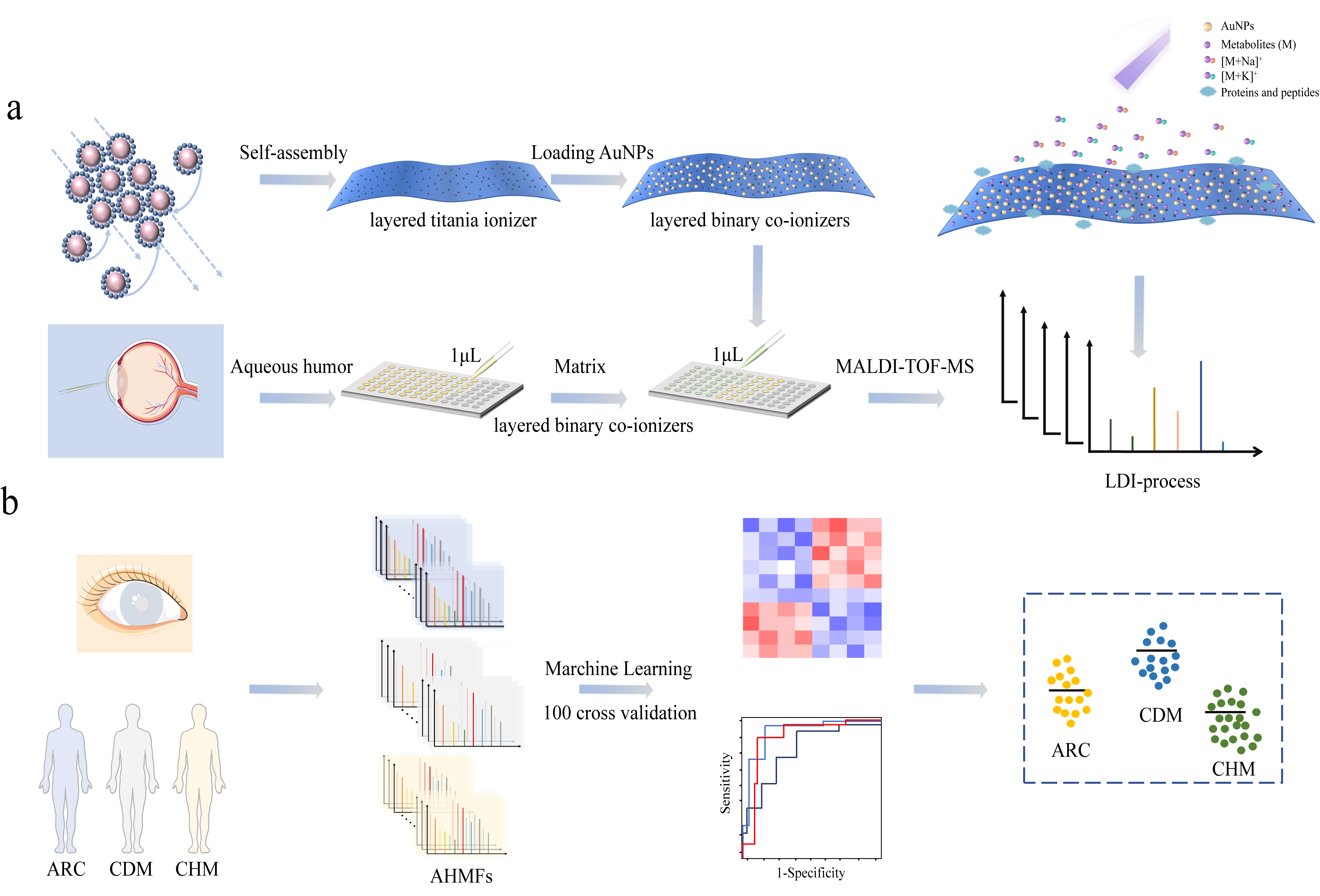最近,邓春晖教授团队联合中山医院孙念荣副研究员,眼耳鼻喉科医院蒋永祥教授一起针对以上问题构建了一种基于MALDI质谱的层状二元共离子体辅助房水代谢分析平台,用于对白内障进行潜在的病因学分型和检测。仅需要1 μL的房水样品,即精准、快速、高通量地实现对年龄相关性白内障(ARC)、糖尿病状态白内障(CDM)和高度近视状态白内障(CHM)的检测。相关结果近期发表在Advanced Science上。