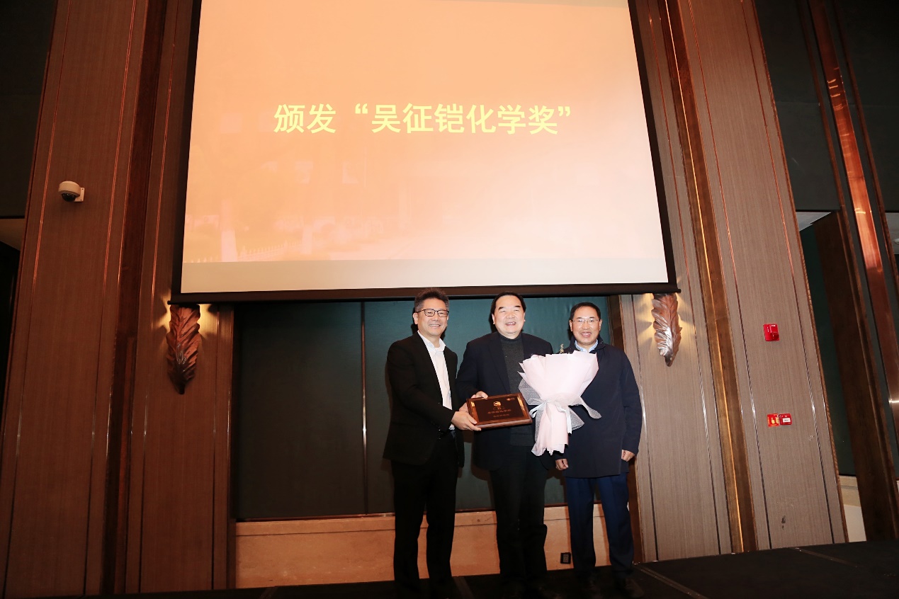报告会由草莓视频 系主任周鸣飞教授主持。为了表彰包信和院士在催化科学领域做出的卓越贡献,近思讲坛组委会决定授予包院士“吴征铠化学奖”,蔡彤先生和谭瑞清先生为包院士颁发了奖牌。