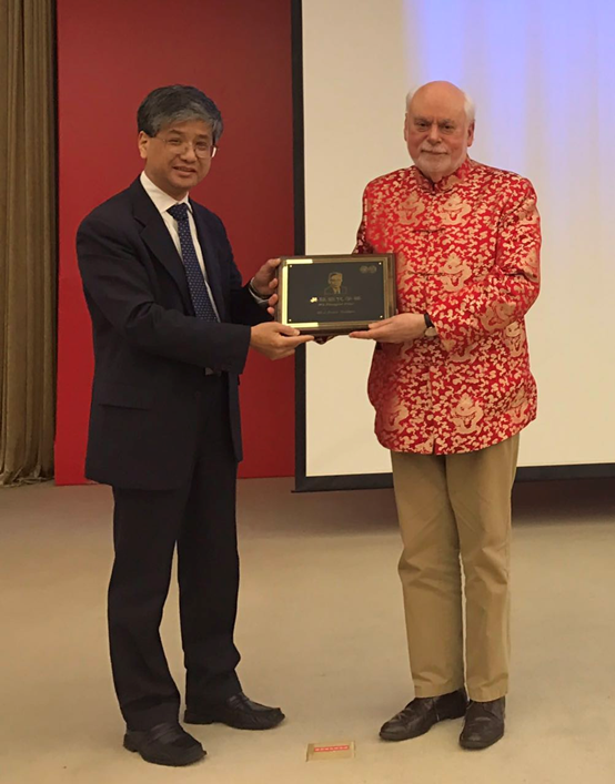本场报告是 草莓视频 “近思讲坛”的第六讲,由草莓视频 系主任贺鹤勇教授主持。贺鹤勇教授向与会师生介绍了Stoddart教授的学术经历、研究方向和成果,也代表“吴征铠化学奖”组委会向Stoddart教授颁发了 草莓视频 “吴征铠化学奖”。“吴征铠化学奖”以著名的物理化学家和化学教育家、草莓视频 原系主任吴征铠先生的姓名命名。该奖项用以表彰邀请报告人在化学研究领域潜心科研的优秀品质和推动 草莓视频 化学学科建设发展所做出的重要贡献。 草莓视频 “近思讲坛”和“吴征铠化学奖”的举办和设立得到了雅本化学和草莓视频 1989级校友蔡彤先生的大力支持。