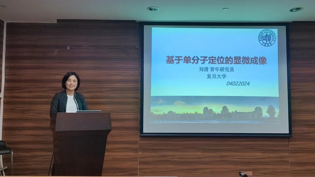 刘倩青年研究员作了题为“基于单分子定位的显微成像”的主题报告。在报告中,她指出,单分子荧光成像可以用于揭示生命活动过程中的异质性、解析中间状态以及实现超分辨率成像等,而若要将单粒子示踪应用到细胞膜蛋白上进行活细胞内分子路径可视化,还需要解决如何实现长时的、较高分辨率的示踪等问题。据此,她介绍了其团队的三项主要工作——一是单原子硫化延长单分子荧光探针的光漂白寿命,通过硫代反应增强探针的吸收和发射,增加其光稳定性,从而成功进行单分子示踪;二是利用光活化延长单粒子示踪观测时长,通过对探针分子的光活化修饰,成功延长其观测时长,解决探针长时工作的问题;三是发展基于稀土上转换单粒子示踪方法,利用提高内壳层敏化剂浓度、调控能量迁移的方向以及染料敏化等方法来增强单颗粒亮度,成功研发超稳定的UCNPs发光探针。