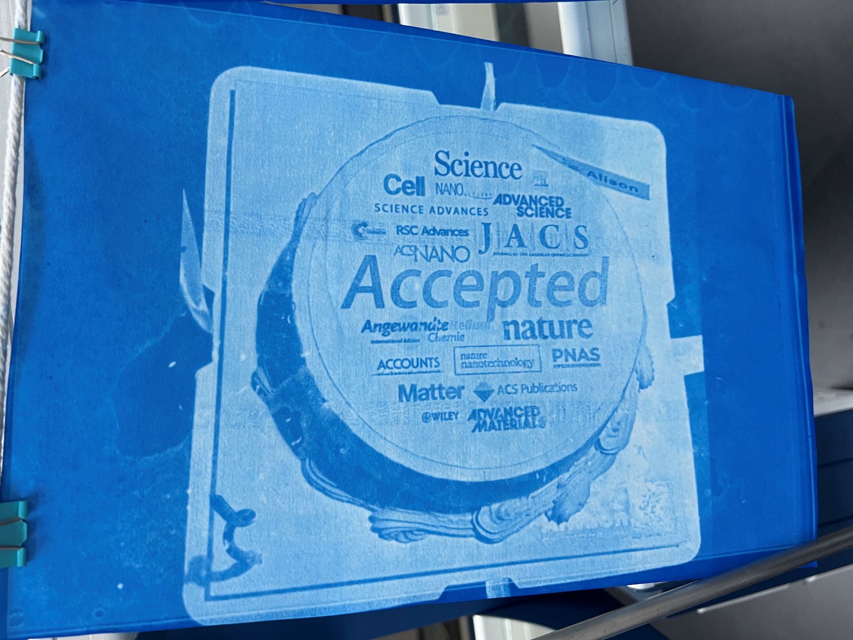 第六天,冯玮老师带领大家进行了三草酸合铁酸钾的制备实验。制备完成以后,同学们把三草酸合铁酸钾溶液与赤血盐溶液混合作为光敏染色剂,并采用不同的模板,制作了风格多样的印染作品。同学们的作品最后被塑封包装,分享后各自带回家留作纪念。