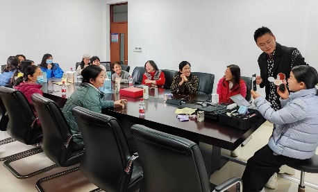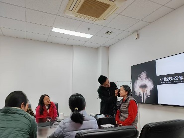 活动伊始,化妆老师首先向大家介绍了日常护肤的基本知识和流程,包括在护理时对化妆水、精华、面霜等产品使用的正确排序。接着,化妆老师通过教学课件的分类展示,详细讲解了职场妆容的打造过程,包括如何针对自己的肤色选择合适的气垫底妆、在修剪和描画眉形时应着重哪些细节、通过搭配唇色和穿搭选择适合自己的唇膏等实用贴士。最后,他还邀请了几位女教师上前,亲自指导她们如何根据自己的脸型、肤质等特点打造合适的妆容,让参与者亲身体验化妆的乐趣,掌握实用的化妆技巧。