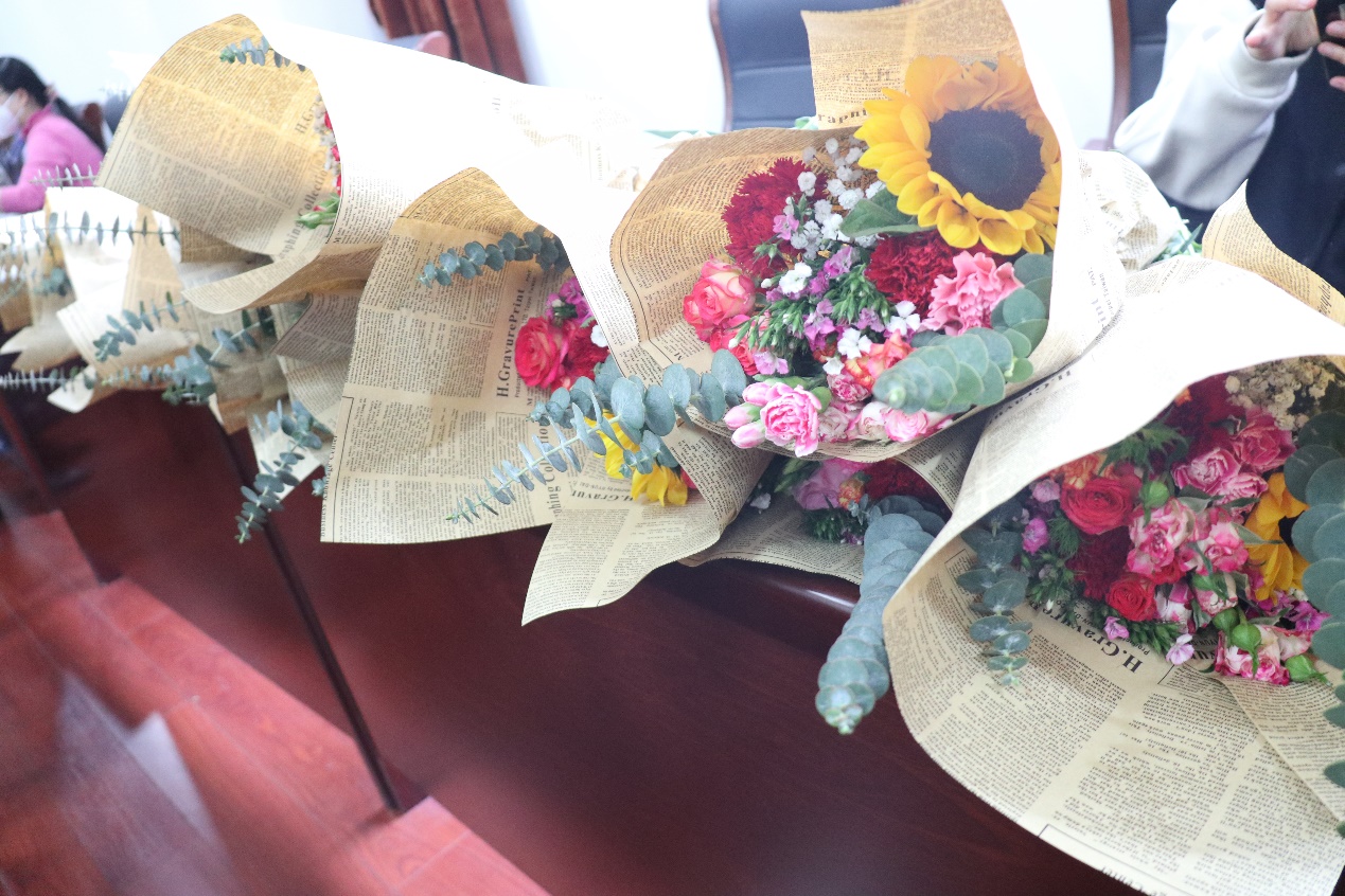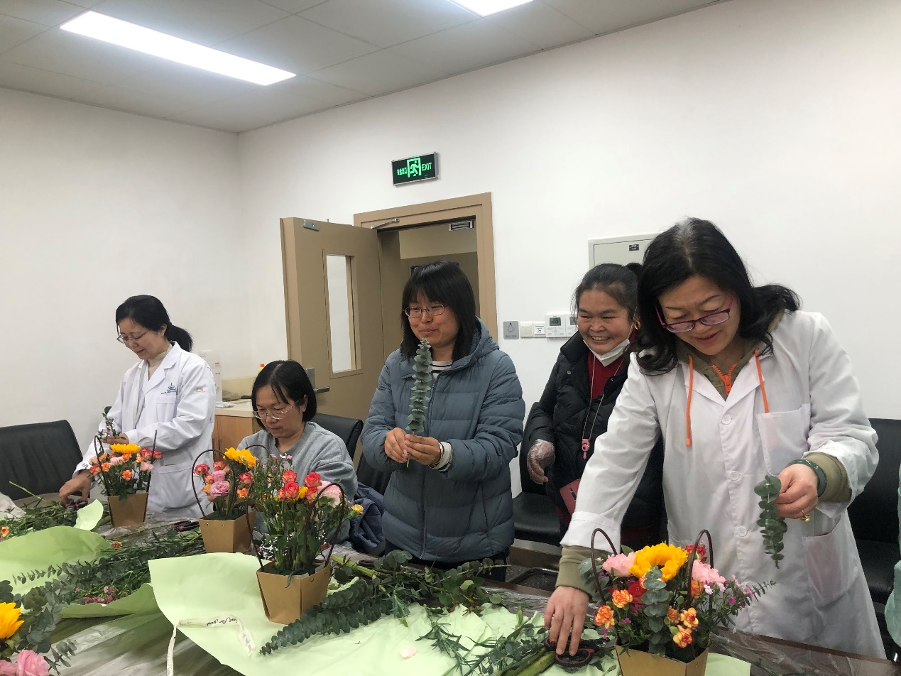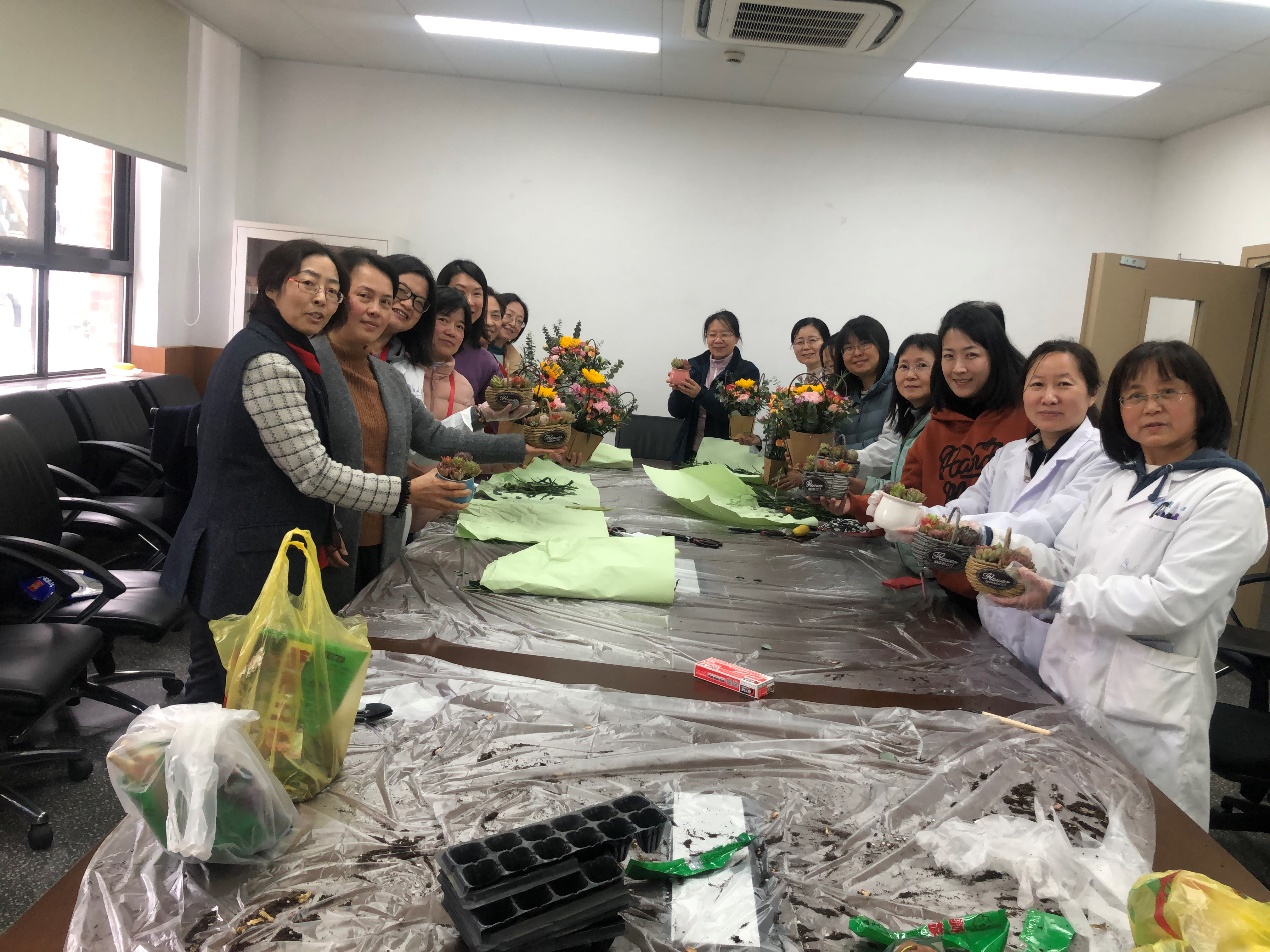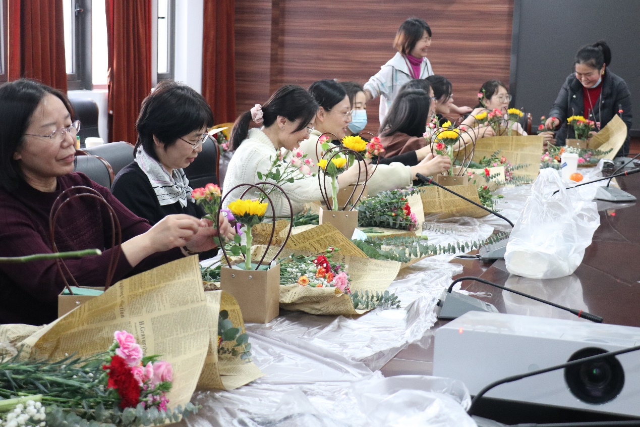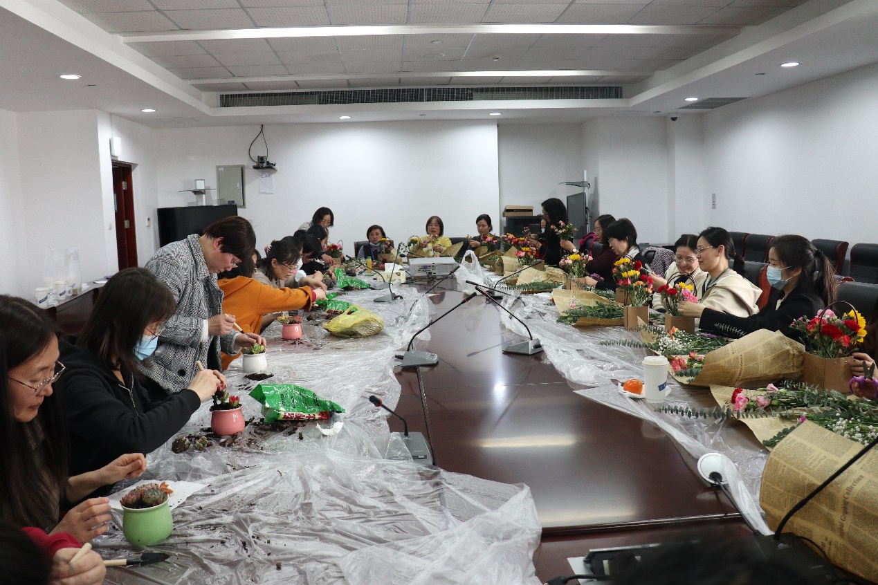 选择插花的教师们,在园艺师的指导下,手持剪刀,细致修剪着鲜嫩的花枝、调试高低、小心插入花泥,直至完成。而种植多肉的老师们,则小心地将花泥装入花盆,通过压、挪、定位,尽可能地调整到最佳造型,看似娇嫩的鲜花、多肉,在老师们的手中,很快变身成一个个春意盎然、独具匠心的花篮,或一盆盆生机勃勃、出挑俊秀的多肉组合。老师们一边欣赏着自己的作品,不时和自己邻座的同伴交流着,赞美着。热闹而简单的花艺摆弄和多肉种植,为繁忙的工作平添一丝休闲时光,祝所有的女性教师们节日快乐。