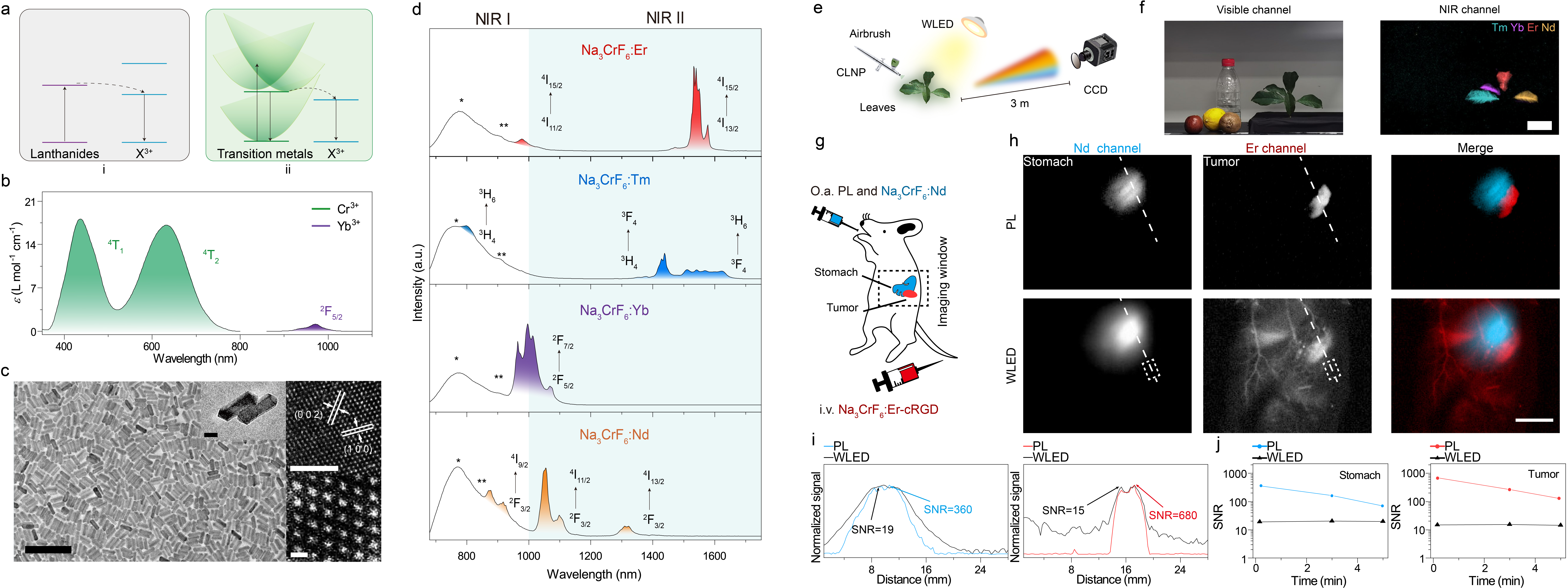 针对以上难题,张凡团队()开发了一系列尺寸均一,结构和发射波长可调的新型过渡金属元素铬敏化的镧系纳米发光颗粒(Cr3+-sensitized lanthanide-doped nanoparticles, CLNPs)。三价铬离子作为人体必需的微量元素,同时具有较高的光吸收截面。其摩尔消光系数是常用的镧系敏化剂的十四倍,使其对激发光具有更强的收集能力。团队首次在纳米尺度实现了过渡金属离子对于六种镧系激活剂的敏化,发光范围覆盖900-1700 nm。此外,与需要激光激发的传统镧系敏化纳米粒子相比,新型的CLNPs在较弱的环境光照射下即可实现高效近红外发光。CLNPs的亮度比相同尺寸的传统镧系敏化纳米粒子最多高出三百七十倍。团队基于CLNPs良好的光学性质,实现了近红外窗口的四色加密和高信噪比的近红外第二窗口多重成像。这一技术的应用极大地简化了近红外成像的使用条件,同时也拓宽了近红外纳米探针的使用范围。