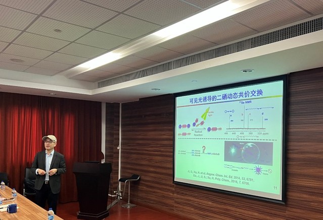 许华平教授围绕非碳主链高分子的研究方向,分享了其团队在含硒和含碲高分子的合成与功能开发方面的系列成果。他结合超分子科学、高分子科学与材料科学,详细介绍了含硒共价键的本质及其动态特征,并展示了利用这些特性制备自修复材料和形状记忆材料。此外,许华平教授还分享了利用聚碲氧烷的独特结构带来的特殊性能,如辐射防护、光催化、动态材料和生物医学等众多应用。在报告结束后,与会的师生们积极参与了与许华平教授的热烈讨论。许华平教授针对与会者提出的相关学术问题,进行了深入而详尽的解答,分享了自己在该领域的研究经验和见解。讨论中,师生们踊跃发言,气氛热烈,体现了浓厚的学术氛围。