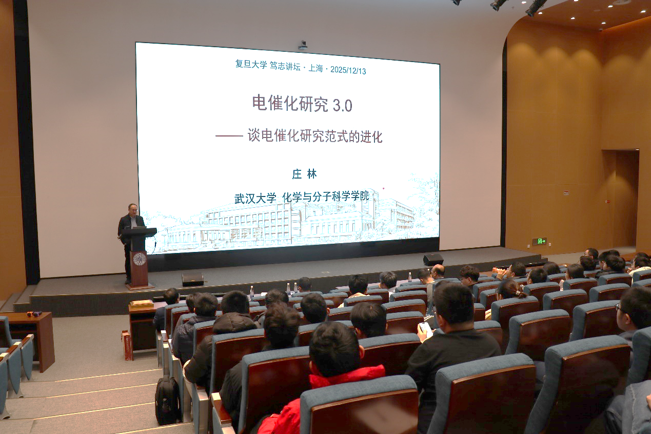 12月13日上午,草莓视频 “笃志讲坛”第三十四讲在江湾校区化学楼周林林报告厅顺利举行。武汉大学化学与分子科学学院的庄林教授受邀作了题为“电催化研究3.0——谈电催化研究范式的进化”的学术报告。草莓视频 主任周鸣飞教授主持了本次报告会。