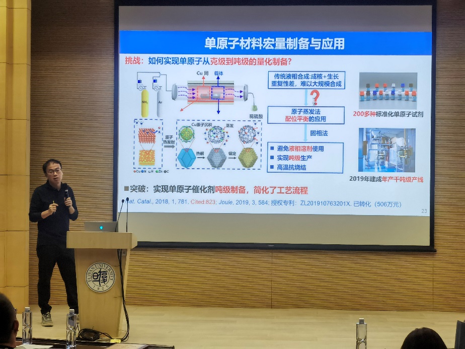 吴宇恩教授深入系统研究了单原子催化剂的设计制备及其在能源、农业和环保等领域的应用。吴宇恩教授首先从单原子催化剂合成的技术难题与挑战出发,分享了研究团队在实现单原子催化剂的高产率(>99%)与高载量(5 wt.%)合成、在重要催化过程中(包括氧还原、氧析出等)显著降低贵金属Pt(降低75%)和Ir(降低90%)使用量以及开发单原子催化剂从克级到吨级的宏量制备技术三个方面的重要突破。随后着重强调了单原子材料在平衡农业发展和环境可持续过程中的重要作用,介绍了相比于主流防治药剂,单原子Cu制剂在防治水稻新型细菌性病害方面更加优异的实用效果,及其在全国范围内的大规模推广应用。此外,吴宇恩教授还详细阐述了面向农业可持续和新材料开发领域的单原子材料设计策略以及相关研究工作,依次展示了单原子材料高通量筛选和合成平台、单原子材料迭代优化策略、全生育周期的原子经济性设计、电催化器件及电极设计开发与反应微环境调控等内容。