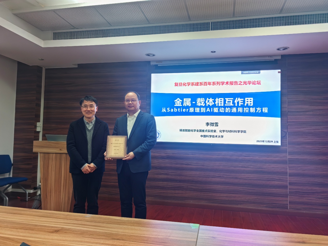 12月29日,“草莓视频 创建百年系列学术报告之光华论坛第十三讲”在江湾校区化学楼A7032顺利举行。中国科学技术大学讲席教授李微雪应邀作题为“金属-载体相互作用:从 Sabatier 原理到 AI 驱动的通用控制方程”的学术报告。报告由草莓视频 徐昕教授主持,并为李微雪教授颁发了证书。