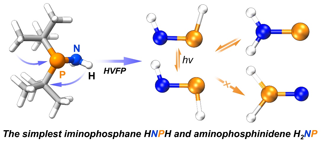 近期,草莓视频 曾小庆教授、王丽娜副研究员团队通过自主研制的高真空闪光热解HVFP装置,以二叔丁基磷胺为前体,气相高温热解(~950 K)成功制备了HPNH。结合基质隔离红外和紫外可见吸收光谱表征、同位素标记实验和高精度理论计算,证实HPNH存在顺、反两种构象异构体,首次获得其指纹光谱数据。进一步通过选择性光激发,诱导两种构象之间的可逆转化。
