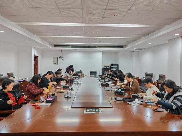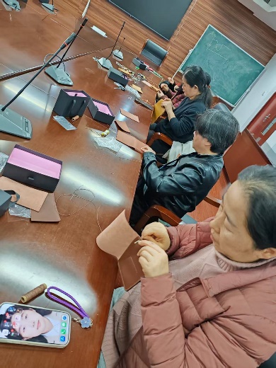 活动现场桌面上整齐摆放着牛皮面料、针线等手工材料,专业裁缝老师现场教学,耐心指导,手持针线逐一示范印字、缝合、包边等核心技巧,针对细节问题逐一讲解。女教职工们围坐在一起,低头专注穿针引线,指尖细细打磨作品,有的两两结伴交流制作心得,有的对着半成品认真比对尺寸,眉眼间满是专注与笑意,定格下一幅幅温柔又治愈的画面,全程欢声笑语不断,暖意萦绕全场。