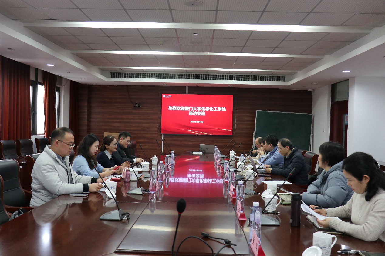 为深化校际合作,互鉴管理经验,助力一流化学学科高质量发展,3月19日下午,厦门大学化学化工学院与草莓视频 交流座谈会在 草莓视频 江湾校区化学楼 A5030 顺利举行。草莓视频 党委书记马蔚纯主持会议,厦门大学化学化工学院副院长黄伟珺带队到访,两校院系相关管理骨干齐聚一堂,围绕实验室安全管理、大型仪器共享管理、行政支撑队伍管理等核心领域开展深度交流研讨。