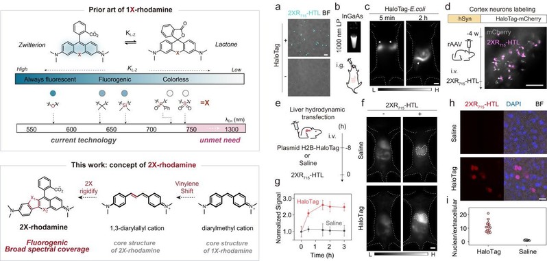 Chemigenetic fusion of synthetic dyes with genetically encoded protein tags presents a promising avenue for in vivo imaging. However, its full potential has been hindered by the lack of bright and fluorogenic dyes operating in the “tissue transparency” near-infrared window (NIR, 700–1700 nm). Here, we report 2X-rhodamine (2XR), a novel bright scaffold that allows for the development of live-cell-compatible, NIR-excited variants with strong fluorogenicity beyond 1000 nm. 2XR utilizes a rigidified π-skeleton featuring dual atomic bridges and functions via a spiro-based fluorogenic mechanism. This design affords longer wavelengths, higher quantum yield (ΦF = 0.11), and enhanced fluorogenicity in water when compared to the phosphine oxide-cored, or sulfone-cored rhodamine, the NIR fluorogenic benchmarks currently used. We showcase their bright performance in video-rate dynamic imaging and targeted deep-tissue molecular imaging in vivo. Notably, we develop a 2XR variant, 2XR715-HTL, an NIR fluorogenic ligand for the HaloTag protein, enabling NIR genetically encoded calcium sensing and the first demonstration of in vivo chemigenetic labeling beyond 1000 nm. Our work expands the library of NIR fluorogenic tools, paving the way for in vivo imaging and sensing with the chemigenetic approach.