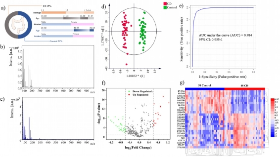Currently, most Crohn's disease (CD) patients suffer from serious complications and even surgery due to delayed diagnosis; therefore, point-of-care diagnosis of CD is urgently required. In this work, a covalent organic framework@Au (COF-V@Au) matrix material with excellent laser absorption is prepared, endowing metabolites with great ionization efficiency in laser desorption/ionization mass spectrometry (LDI-MS) analysis. In addition, the COF-V@Au matrix possesses 1093 m2 g−1 of large specific surface area and around 2 nm of average pore size, providing abundant sites and efficient structure for metabolite adsorption. Benefiting from high throughput, high sensitivity, and high ionization efficiency of COF-V@Au assisted LDI-MS, the extraction of serum metabolic fingerprints of CD group and healthy group is implemented. Moreover, the two groups are successfully distinguished with an area under the curve (AUC) value of 0.984 by establishing an orthogonal partial least squares discriminant analysis (OPLS-DA) model of Crohn's patients versus healthy controls. Moreover, the expression of 25 features is determined as the prominent metabolic differences between CD patients and the controls. Furthermore, the terminal ileum and ileocolon subtypes of CD are also distinguished from healthy controls with AUC value of 0.989 and 0.991, respectively. Thus, this COF-V@Au-assisted LDI-MS method is expected to be a clinical diagnostic technology in the future.