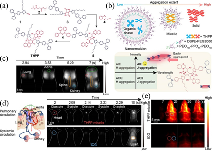 Fig. 1 (a) Scheme for the simplified synthetic route of THPP. (b) Scheme for the nanoemulsion, micelle and solid of THPP represent different aggregation extent, respectively (above) and quadrantal diagram for the special AIE and J-aggregation feature of THPP (below). (c) NIR-II imaging at 17 FPS from dorsal view of a nude mouse over time. (d) NIR-II imaging at 17 FPS from dorsal view of a nude mouse over time. (e) Time-lapse images of mice cerebral vasculature with carotid arterial thrombosis to the left hemisphere, after administration of THPP micelles and ICG.