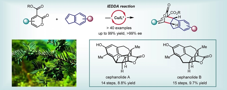 An inverse-electron-demand Diels–Alder (IEDDA) reaction could complement the conventional normal-electron-demand Diels–Alder reaction in the synthesis of six-membered carbocycles. However, catalytic asymmetric all-carbon-based IEDDA reactions are underdeveloped. Herein, we disclosed a copper-catalyzed asymmetric IEDDA reaction using electron-deficient 3-carboalkoxyl-2-pyrones and electronically unbiased indenes as reactants. This method enables the rapid and enantioselective construction of a wide range of hexahydrofluorenyl bridged-lactone scaffolds. Using this method, asymmetric total syntheses of cephanolides A and B were accomplished.