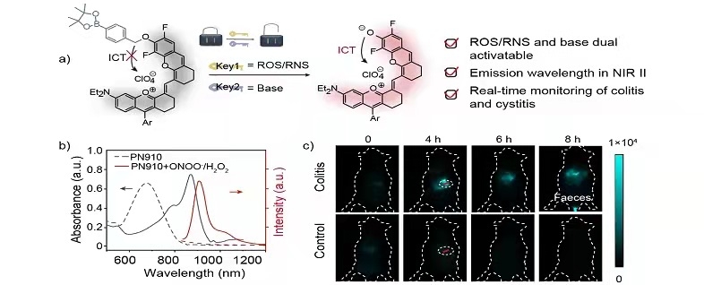 Inflammation usually results in high-level reactive oxygen species (ROS) and reactive nitrogen species (RNS) not only in acidic tissue but also in alkaline tissue. However, noninvasively in vivo monitoring reactive species specifically within alkaline tissue remains a huge challenge. Here we introduce a dual activatable fluorescent probe PN910 located in the second near-infrared window (NIR-II, 900–1700 nm), which shows high selectivity toward H2O2 and OONO− at pH beyond 7.4. Then we verified that PN910 could be used for the real-time, specific and accurate monitoring of cystitis and colitis for living animals. This report presents a unique approach to the development of dual activatable probe for in vivo biosensing.