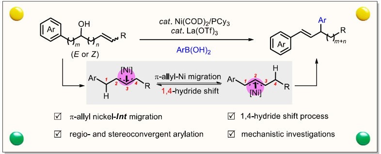 Transition-metal-catalyzed allylic substitution reactions (Tsuji−Trost reactions) proceeding via a π-allyl metal intermediate have been demonstrated as a powerful tool in synthetic chemistry. Herein, we disclose an unprecedented π-allyl metal species migration, walking on the carbon chain involving 1,4-hydride shift as confirmed by deuterium labeling experiments. This migratory allylic arylation can be realized under dual catalysis of nickel and lanthanide triflate, a Lewis acid. Olefin migration has been observed to preferentially occur with the substrate of 1,n-enols (n ≥ 3). The robust nature of the allylic substitution strategy is reflected by a broad scope of substrates with the control of regio- and stereoselectivity. DFT studies suggest that π-allyl metal species migration consists of the sequential β-H elimination and migratory insertion, with diene not being allowed to release from the metal center before producing a new π-allyl nickel species.