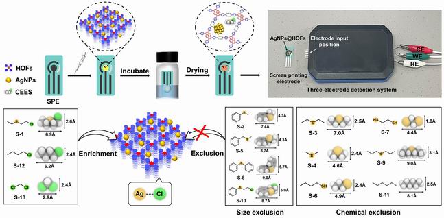 The rapid, discriminative, and portable detection of highly toxic chemical warfare agents is extremely important for response to public security emergencies but remains a challenge. One plausible solution involves the integration of porous molecular traps onto a photo-electrochemical (PEC) sensor. Here, we developed a fast and facile protocol to fabricate sub-1 nm AgNPs encapsulated hydrogen-bonded organic framework (HOF) nanocomposite materials through an in situ photoreduction and subsequent encapsulation process. Compared to traditional semiconductors and selected MOF materials, these AgNPs@HOFs show significantly enhanced photocurrent. Most importantly, the portable PEC device based on AgNPs@HOF-101 can selectively recognize 9 different mustard gas simulants, including 2-chloroethyl ethyl sulfide (CEES), based on synergistic size-exclusion and specific recognition. The extremely low detection limit for CEES (15.8 nmol L–1), reusability (at least 30 cycles), and long-term working stability (at least 30 days) of the portable PEC device warrant its use as a chemical warfare agents (CWAs) sensor in practical field settings. More broadly, this work indicates that integrating porous molecular traps onto PEC sensors offers a promising strategy to further develop portable devices for CWAs detection with both ultrahigh sensitivity and selectivity.