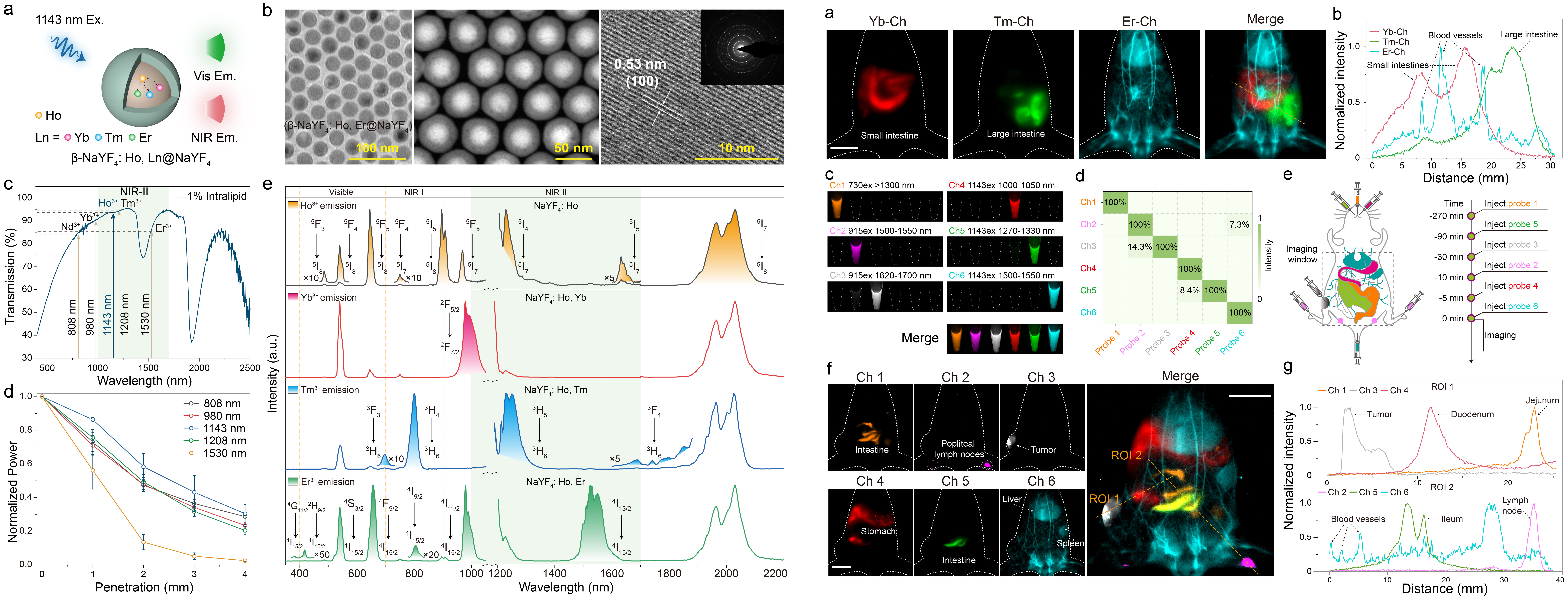 针对上述问题,张凡教授团队开发了一系列基于钬敏化的镧系纳米晶体库(Ho3+-sensitized lanthanide nanocrystals, HSNCs),其激发波长位于1143 nm,能够在1000 - 2200 nm波长范围内产生可调谐的发射,极大地拓展了NIR-II成像探针工具箱。在这项工作中,该团队展示了1143 nm激发波长具有优异的组织穿透性能,特别是在透过高光子散射的颅骨成像中,1143 nm激发的纳米晶体的荧光透过率分别比传统的808 nm和980 nm激发高出15%和10%。此外,利用HSNCs的多发射可调节特性以及其与传统镧系纳米材料无串扰激发的特点,该团队首次成功实现了活体近红外二区6通道成像,可以高清晰度的分辨出活体内多种解剖结构。这项研究为具有NIR-II激发和发射特性的镧系纳米晶体的设计提供了新的见解,并突出了这些材料在活体多靶标可视化检测中的潜力。